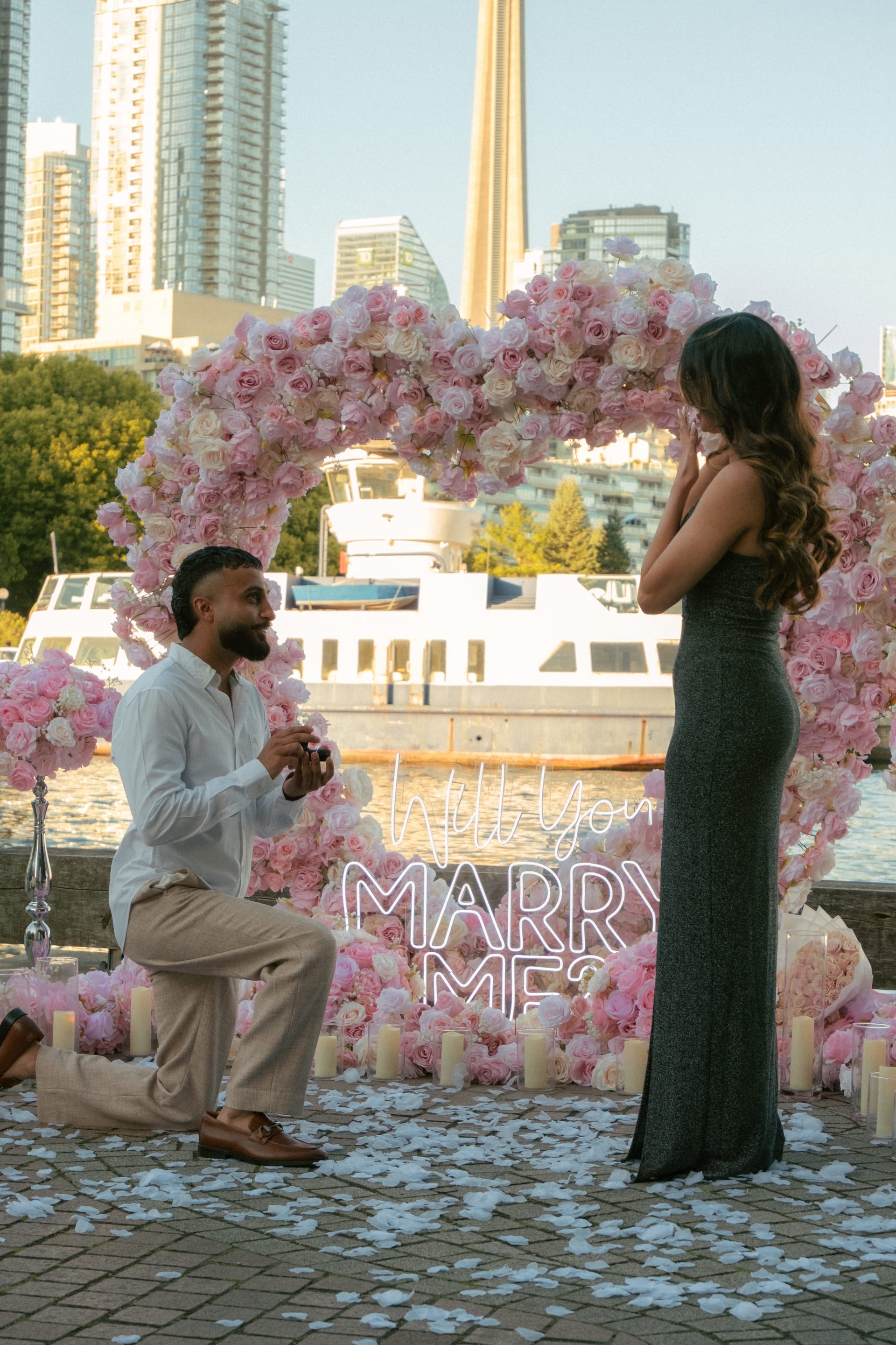 I specialise in discreet proposal coverage across Toronto and the GTA. I arrive early, position myself out of sight, and capture every second — the nervous walk, the drop to one knee, the reaction, the tears, the laugh, the ring close-up. All without your partner ever knowing I'm there.